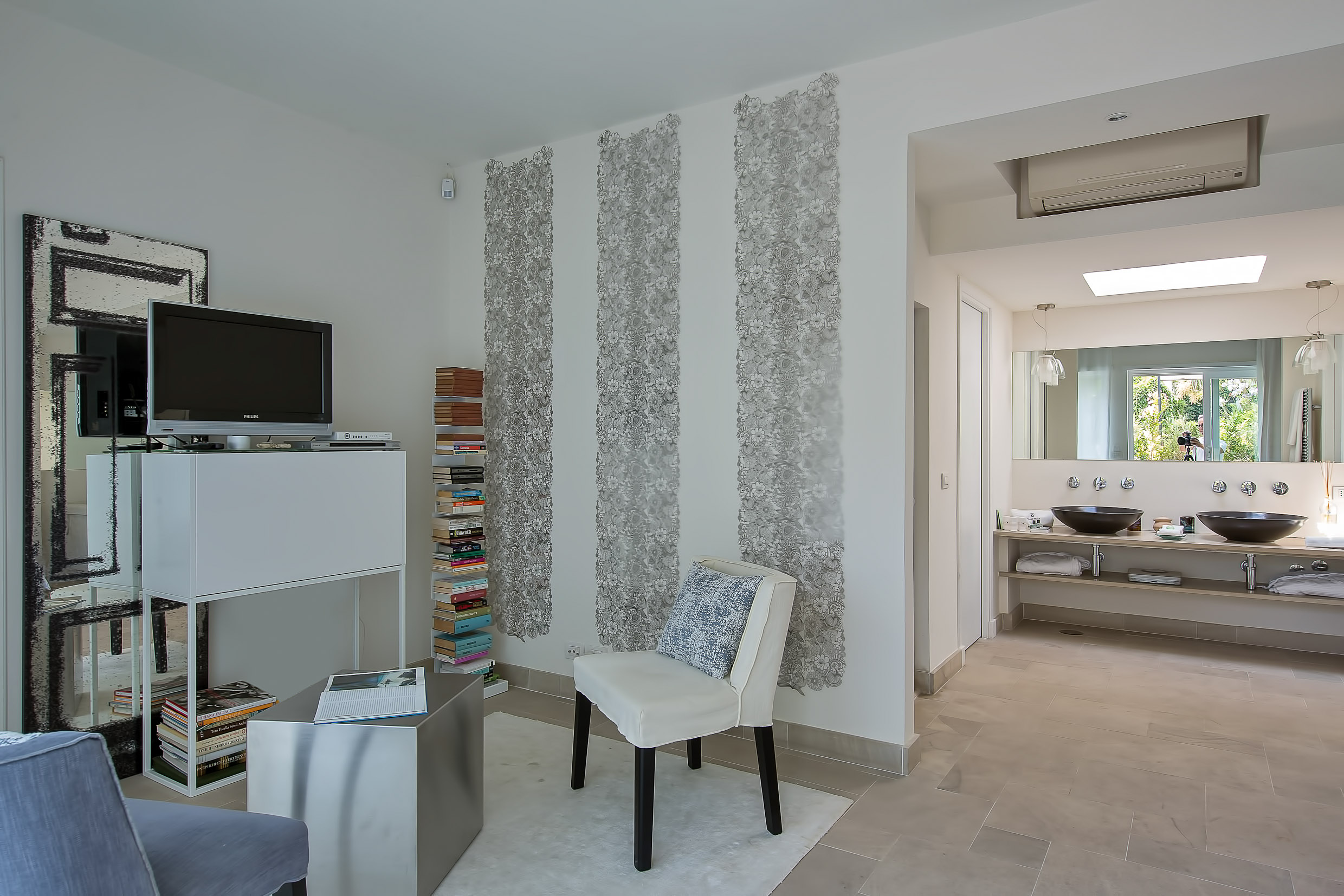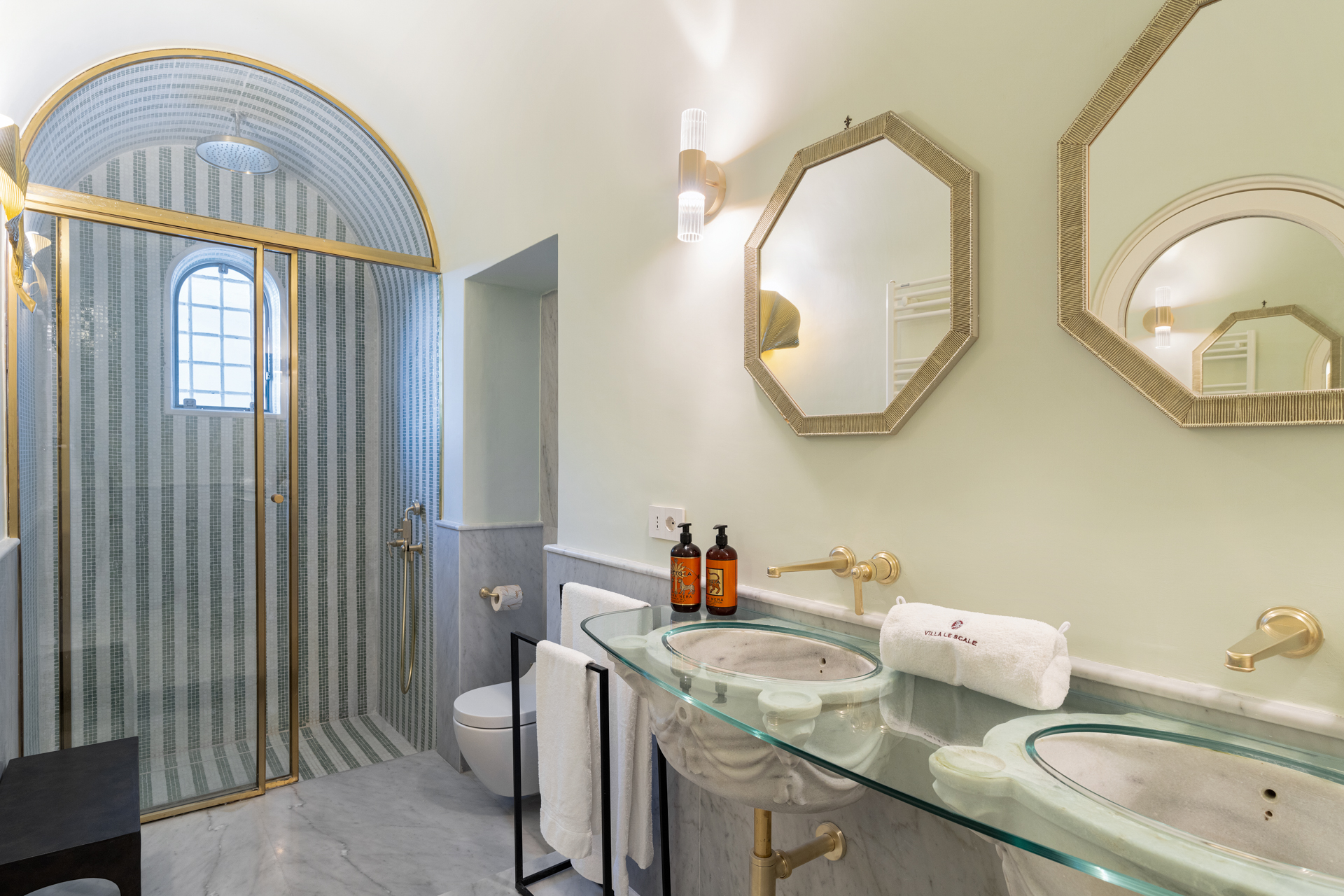 The villa offers seven unique and elegant bedrooms including a two-bedroom, two-bathroom garden suite, all meticulously restored and furnished, immersed in the exquisitely scented and marvellously colourful “literary garden”, equipped with every modern comfort. The rooms are accessible from the ground floor by a flight of 23 steps. The bedrooms have been beautifully furnished in a way that perfectly complement the style of the renovated building. Guests can find sheer relaxation in their spacious bathrooms, which boast, according to the theme of their room, a Turkish bath, plunge pool, duplex shower, or Jacuzzi. Most bedrooms have glorious, flower-covered terraces with superb views of the sea or the gardens. All rooms have air conditioning, Smart TV, safe, mini bar, and wi-fi.