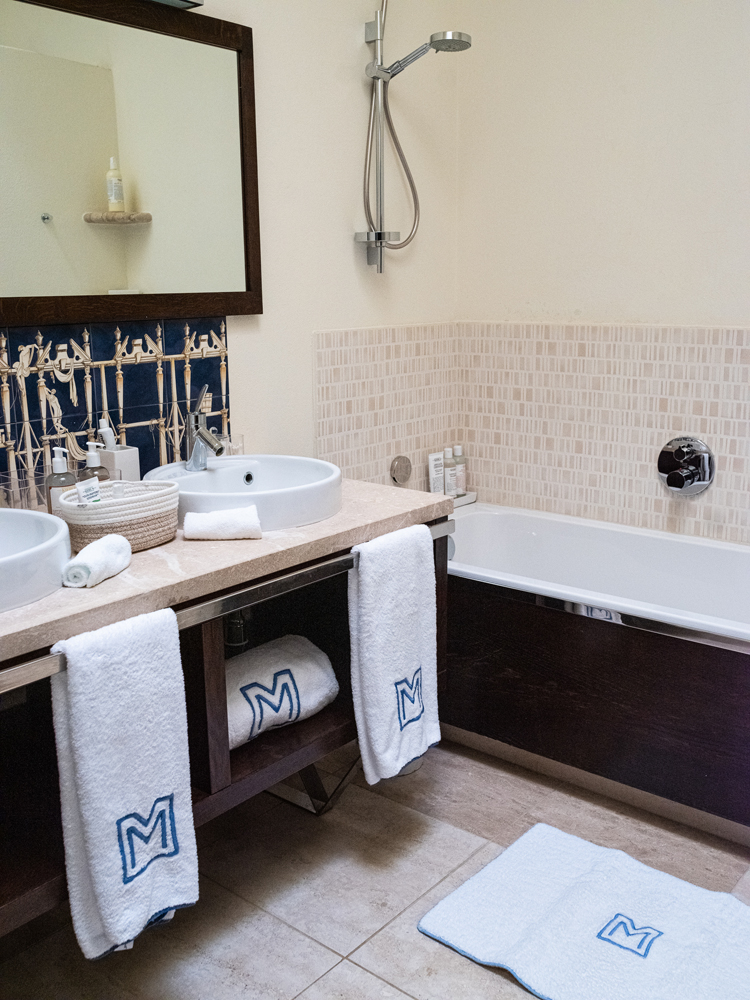 • Shared bathroom with bathtub, separate shower, double sink, toilet